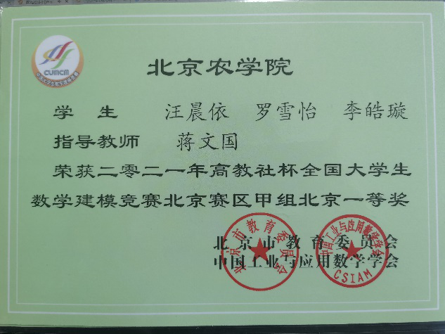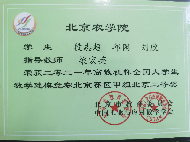 2021年,北京农学院数学建模参赛队员克服疫情期间重重困难,在第三十届“高教杯”全国大学生数学建模竞赛中再创佳绩,摘得北京市一等奖、二等奖各一项,在学校学科竞赛史上又增添了浓重亮丽的一笔。